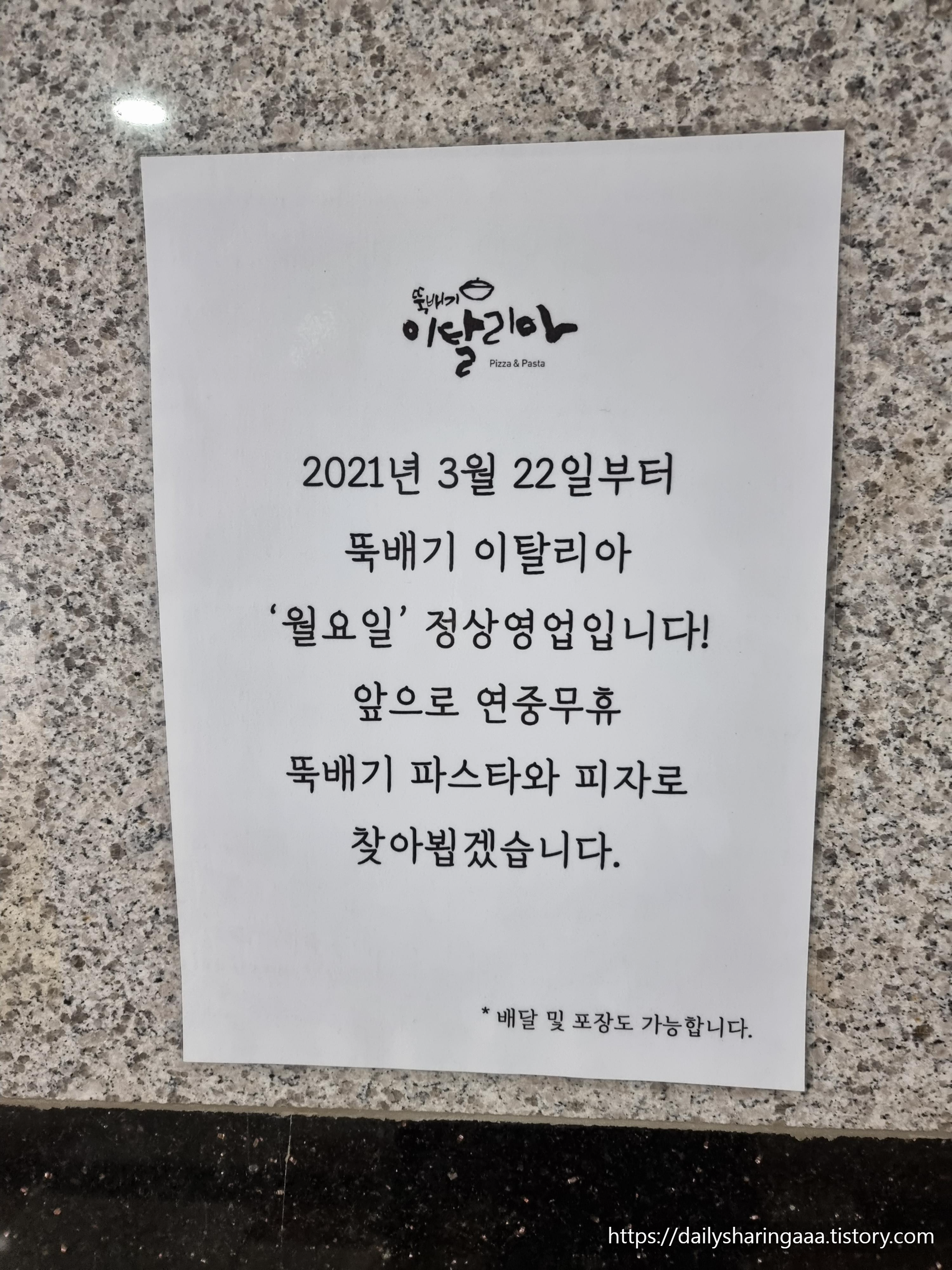 주소 : 인천 서구 중봉대로 612번 길 10-16 마 르씨엘 2층 뚝배기 이탈리아