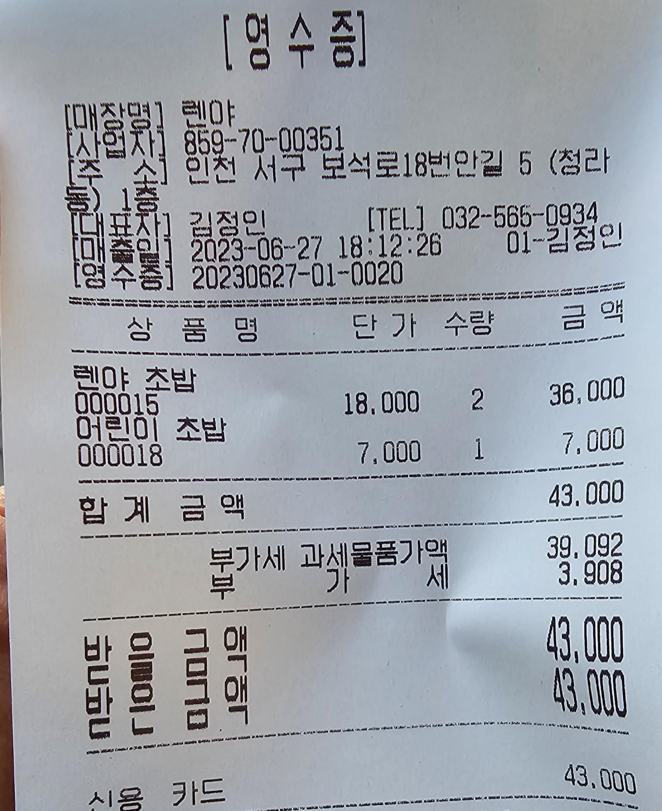 저희가 주문했던 렌야초밥과 어린이 초밥 기준