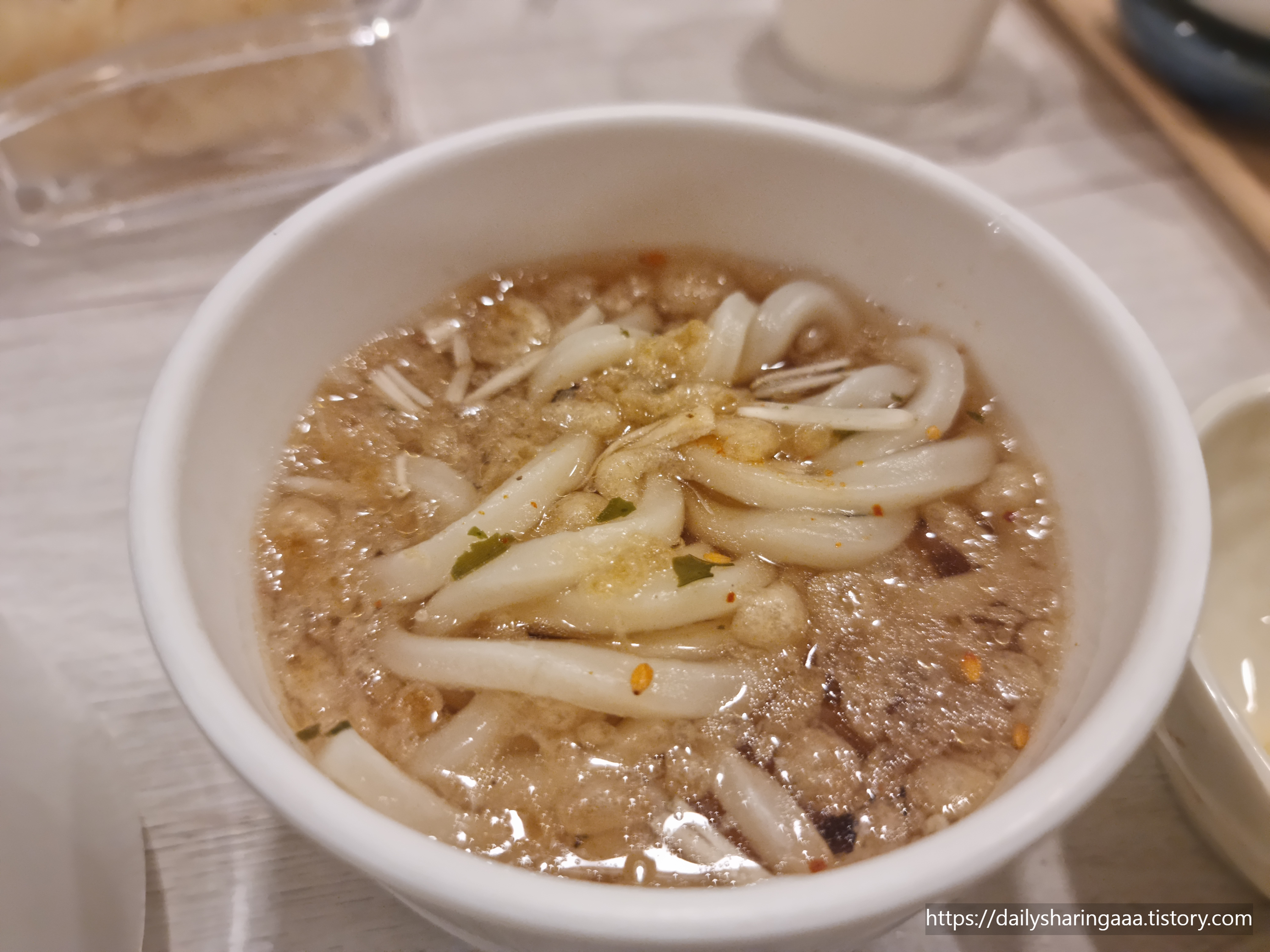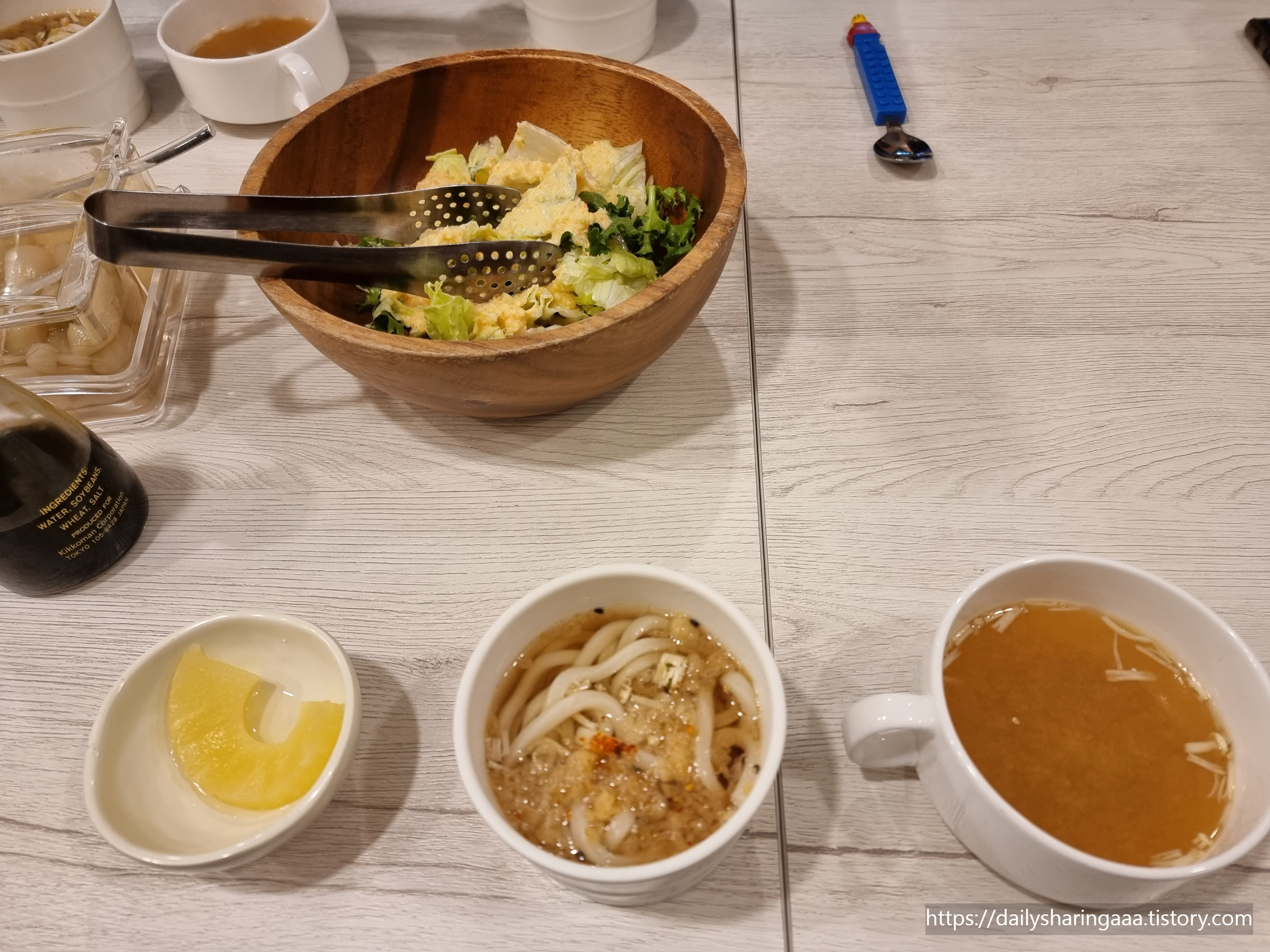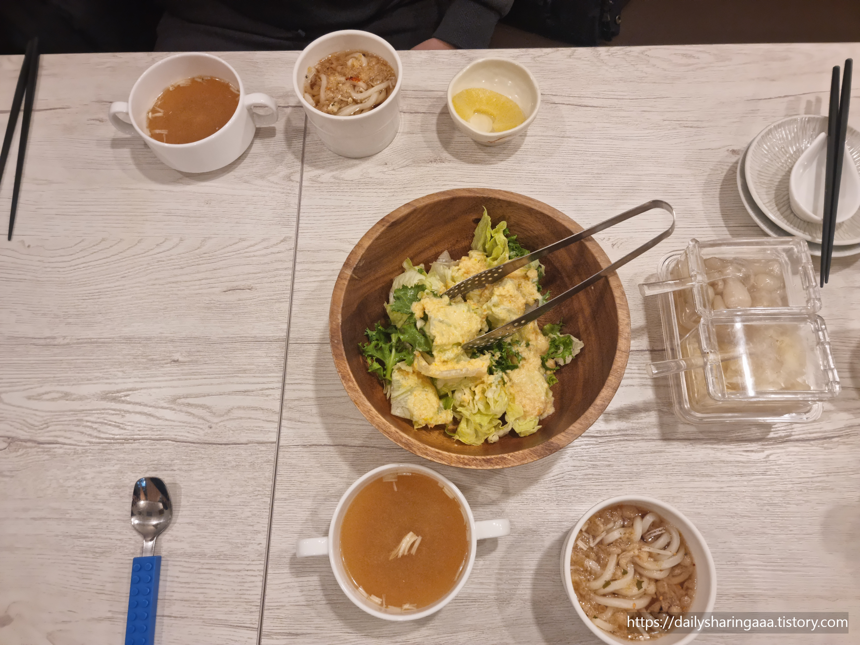 샐러드 와 우동 ,장국 , 락교 , 생강 ,