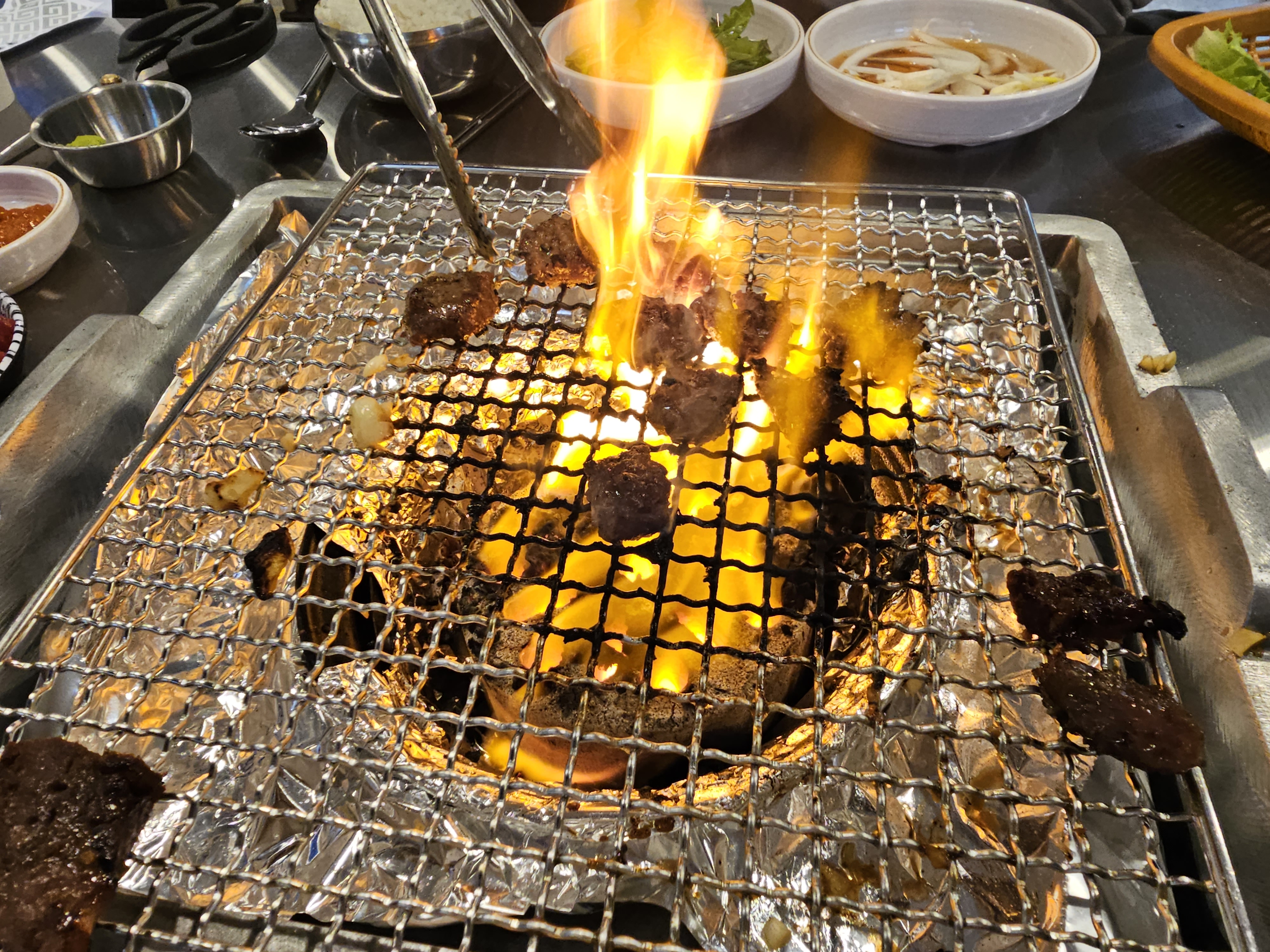 연탄불에 굽고 있는 모습 입니다 ~구우면서 저렇게 불이 올라오는데 타지 않게 조심 해서 구워 주세요 ~다시 봐도 매력있는 맛집입니다 ~